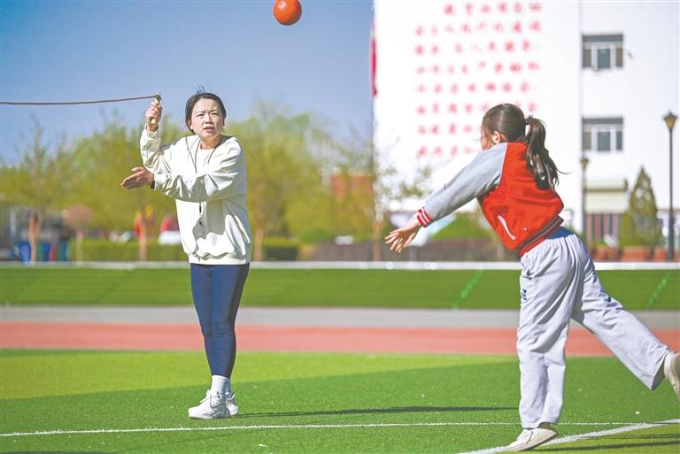 近日,在永宁县闽宁镇原隆小学操场上,来自福建省厦门市南山实验学校的援宁支教教师孙盼盼,带领五年级学生练习投掷实心球。