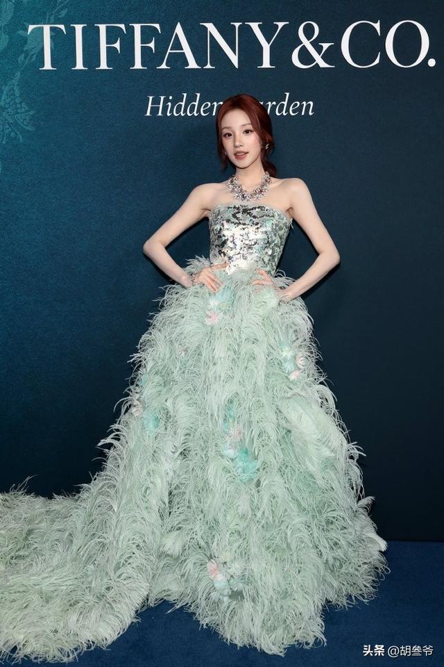 当天宋雨琦身着薄荷绿亮片羽毛高定礼服,颜色清新又梦幻,亮片材质在灯光下闪闪发光,羽毛裙摆随风飘动,灵动又优雅。