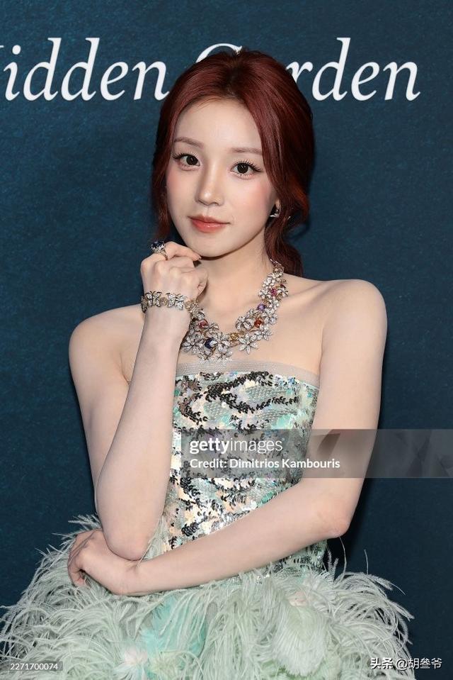 她佩戴的全套珠宝都是当季最新款,钻石藤蔓缠绕颈间,红宝石元素点缀其中,完美呼应“花语秘境”主题。